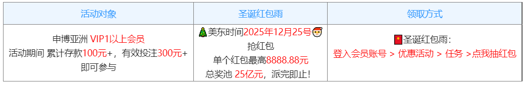 活动内容:圣诞惊喜红包雨,准时降临!在活动期间,全体申博亚洲 VIP1以上的会员累计存款1元+,即可获得参与资格。在活动期间,您将有机会参与盛大的“红包雨”活动,抢赢总奖池高达25亿元的随机现金红包,单个红包最高8888.88元,派完即止!机会难得,立即行动!值此佳节,诚邀您与好友共聚申博亚洲,沉浸于热烈的节日氛围,抢红包,赢豪礼,用丰盛的年终大餐款待您的兄弟们!